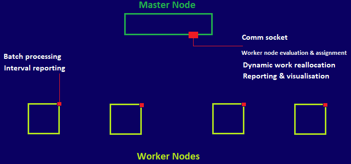 The main node will be responsibale for the worker division, tracking and assembling of all work. Each node is given a socket to stream data. The worker nodes will